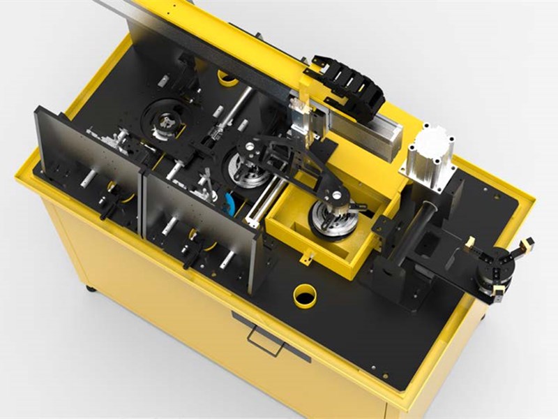 此測量工站由吹氣、內(nèi)徑檢測、厚度檢測、移載機構(gòu)等部分功能組成,機械手將產(chǎn)品放置在右側(cè)的翻轉(zhuǎn)夾爪上,翻轉(zhuǎn)臺將產(chǎn)品放置到吹氣盒中進行吹氣清潔,清潔完成后檢測機械手將產(chǎn)